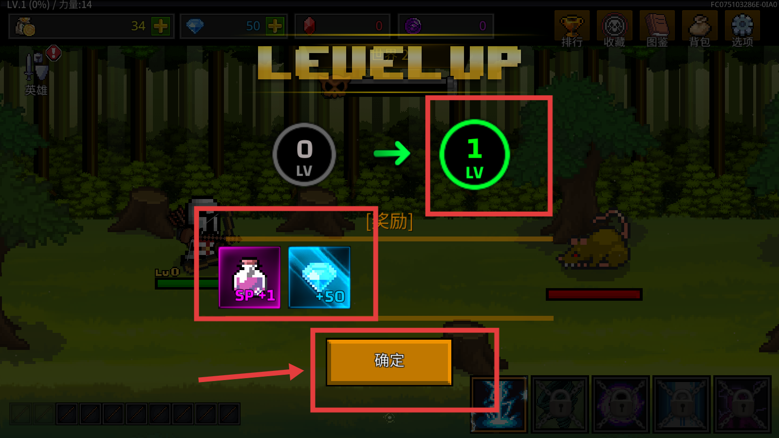4、角色升級(jí)后,可獲得【SP+1】【鉆石+50】等獎(jiǎng)勵(lì),點(diǎn)擊【確定】按鈕領(lǐng)取獎(jiǎng)勵(lì),提升角色實(shí)力。