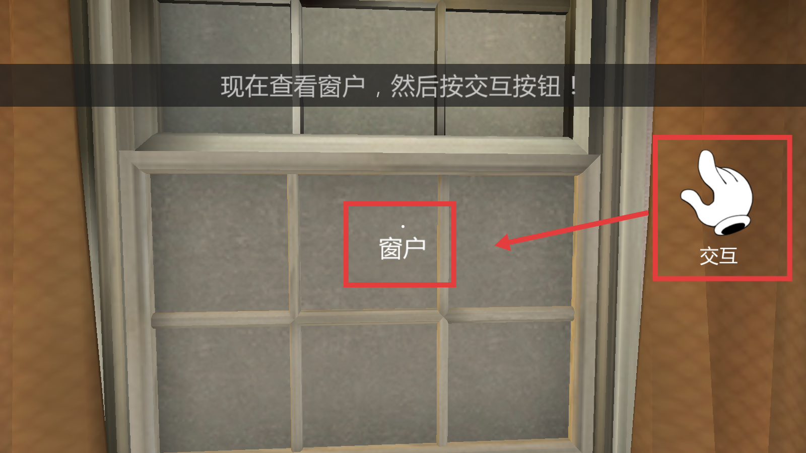 2、按照提示查看窗戶,點擊【交互】按鈕,打開窗戶。