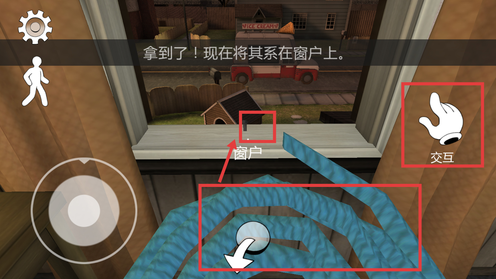 3、拿到物品后,點擊【交互】按鈕,將其系在窗戶上,完成該步驟的操作。