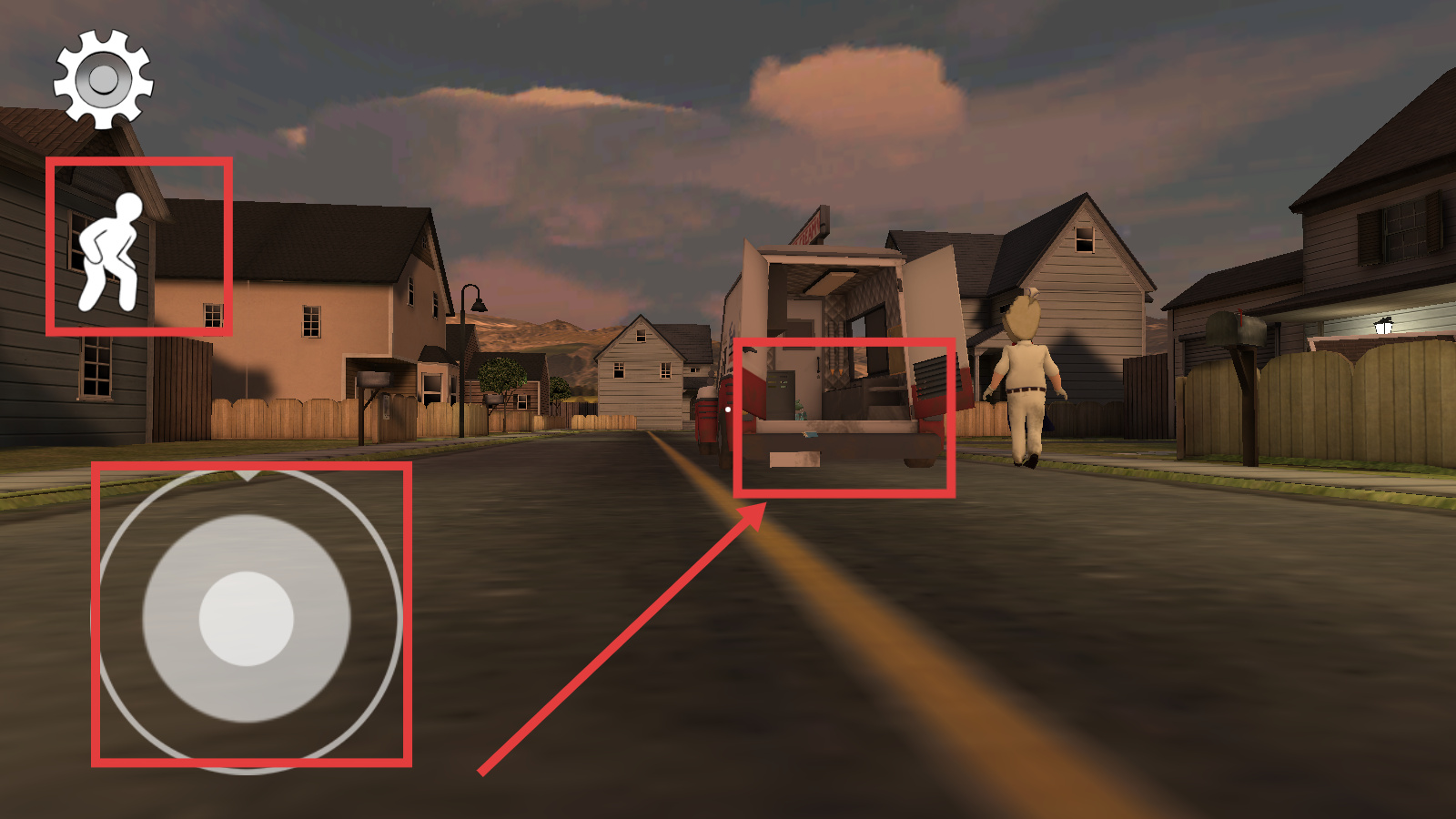 4、通過左側(cè)移動按鈕控制角色下蹲,在街道場景中探索目標(biāo)區(qū)域,推進游戲進程。