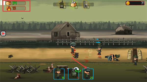 1、關(guān)注左上角資源,【面包-34】代表生命值,【火焰-15】代表能量,合理部署不同類型士兵,提升戰(zhàn)力。