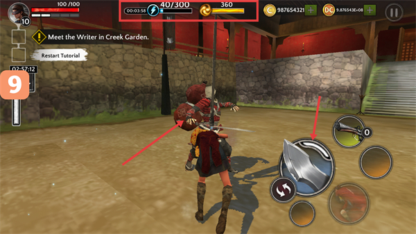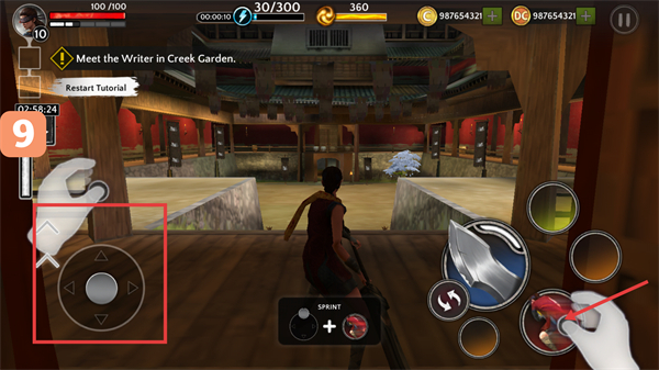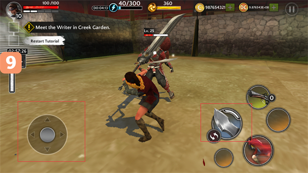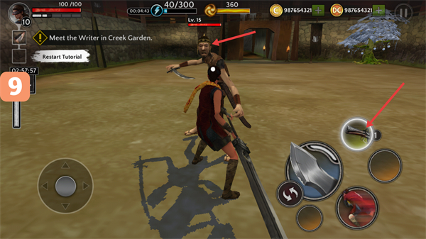 1、利用左側(cè)虛擬方向鍵移動(dòng)角色,前往任務(wù)地點(diǎn)“MeettheWriterinCreekGarden”,途中可使用右側(cè)技能按鈕輔助移動(dòng)或戰(zhàn)斗。