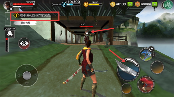 1、推進“在小溪花園與作家見面”任務時,遭遇Lv.10敵人,使用右側刀劍技能按鈕發(fā)起攻擊,注意走位躲避傷害。