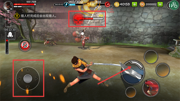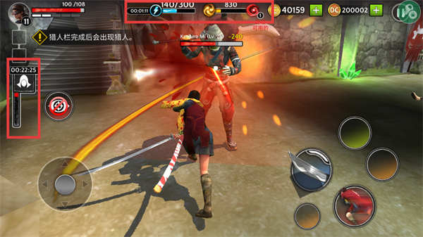 3、面對高等級敵人“KanjuroMi(Lv.25)”時,結合左側虛擬方向鍵移動和右側刀劍技能,靈活輸出傷害,優(yōu)先攻擊其弱點。