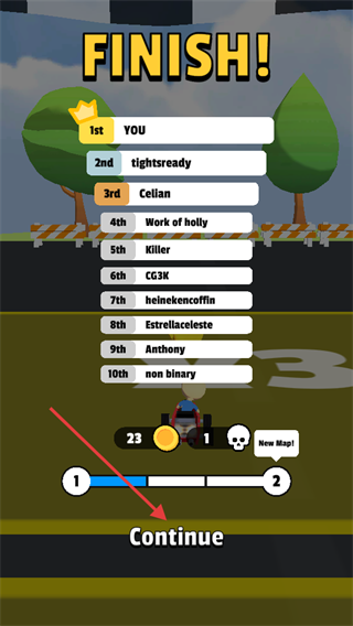 4、比賽結(jié)束后點(diǎn)擊【Continue】進(jìn)入下一場(chǎng),爭(zhēng)取每次都獲得更好的排名以獲取更多獎(jiǎng)勵(lì)。