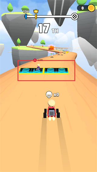 1、行駛中遇到【加速帶】要及時(shí)駛?cè)?,借助其提升卡丁車速度,?zhēng)取靠前排名。