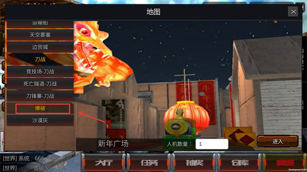 1、在地圖選擇界面中,選定【爆破】模式后選擇【新年廣場】地圖,可先熟悉爆破玩法的基礎(chǔ)節(jié)奏。