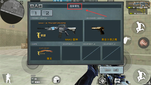 2、進(jìn)入【選擇背包】界面,搭配【M4A1-雷神】主武器、【黃金沙漠之鷹】副武器與【屠龍】近戰(zhàn)武器,提升不同場景的作戰(zhàn)能力。