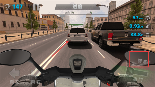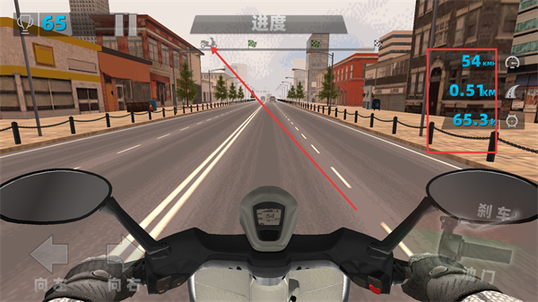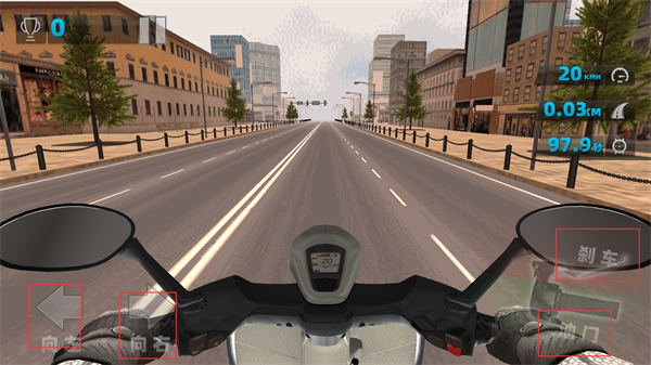 2、利用左右方向按鈕控制轉(zhuǎn)向,油門加速、剎車減速,在城市道路中駕駛摩托車,熟悉操作。