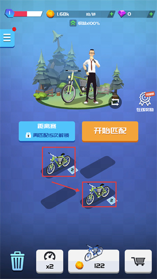 1、點擊【開始匹配】進(jìn)入賽事,可合成相同等級的自行車提升屬性,積累匹配次數(shù)解鎖【距離賽】。