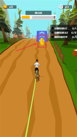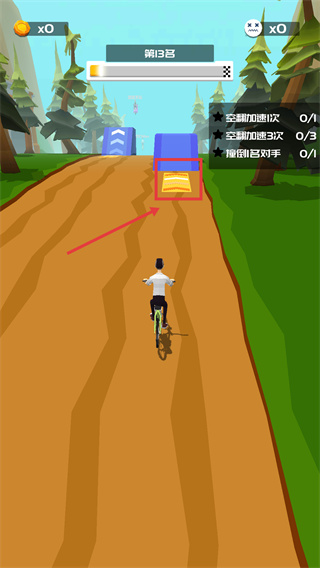 2、比賽中通過坡道時拾取加速道具,完成【空翻加速】任務(wù),同時提升騎行速度以追趕排名。