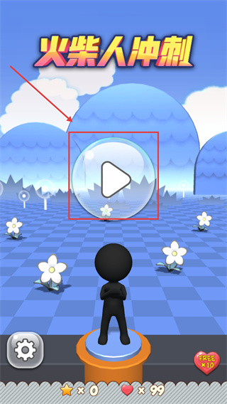 1、在【火柴人沖刺】主界面點擊播放按鈕開啟關卡,賽前可領取【FREE-x10】道具,積累初始資源。