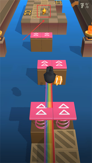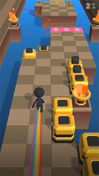 2、關卡中遇到【粉色箭頭方塊】時,通過其可觸發(fā)跳躍,借助該機制跨越障礙推進至【2%】進度區(qū)域。