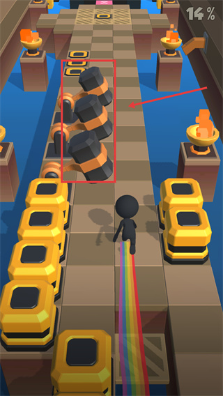 4、面對【機械錘障礙】時,需觀察其擺動節(jié)奏,找準間隙快速通過,避免被擊中以維持【14%】的進度。
