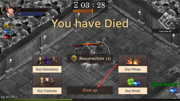 2、若戰(zhàn)斗失敗顯示【You-have-Died】,可選擇復(fù)活繼續(xù),或點(diǎn)擊【Give-up】返回界面重新挑戰(zhàn)。