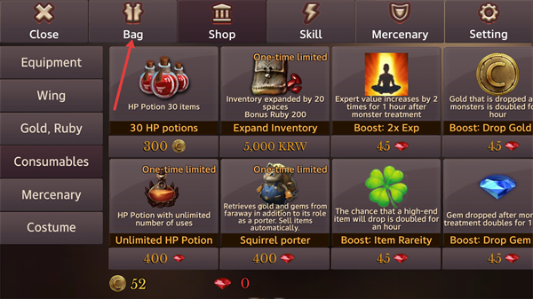 3、打開【Bag】界面,可查看/使用消耗品,也能購買道具增強(qiáng)續(xù)航。