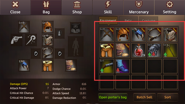 4、在【Bag】的【Equipment】欄,裝備收集到的武器、防具,提升角色的屬性,強(qiáng)化戰(zhàn)力。