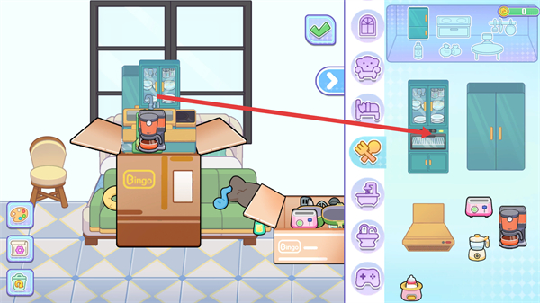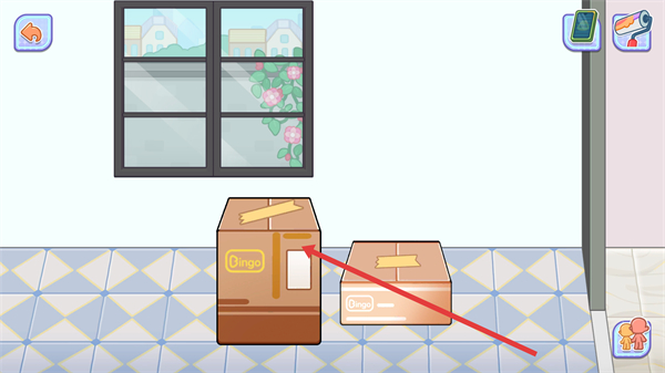 1、進入室內(nèi)界面后,這是一個空的房間,點擊裝有物品的箱子,可開啟裝扮道具,為后續(xù)的空間布置做準備。