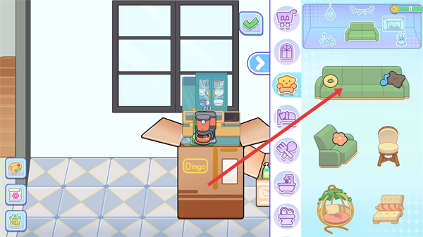 2、在室內(nèi)裝扮界面,切換至【沙發(fā)】分類,點擊帶甜甜圈裝飾的沙發(fā)樣式,即可將其布置到當前的室內(nèi)空間中。