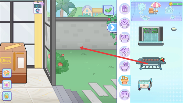 4、進入戶外裝扮界面,選擇【燒烤架】道具,點擊該道具可將其布置到戶外空間,豐富戶外區(qū)域的設施配置。