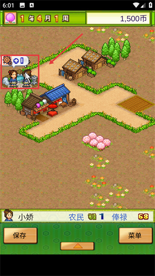 2、游戲初始界面中,居民【小嬌】為【農(nóng)民-等級1】,可通過互動提升其屬性,推動村落發(fā)展。