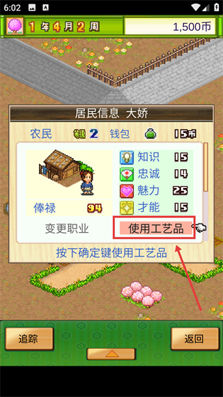 3、在居民信息界面,點擊【使用工藝品】可提升居民屬性,如【大嬌】的知識、忠誠等數(shù)值。
