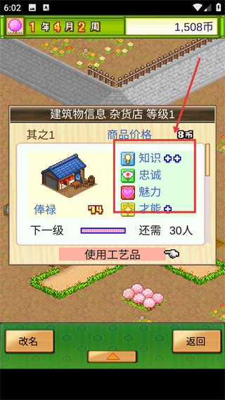 4、【雜貨店-等級1】可消耗8幣購買道具,提升居民屬性,升級需積累30人數(shù)條件。