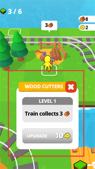 4、觸發(fā)【W(wǎng)OOD-CUTTERS】界面后,查看【LEVEL-1】的【Train-collects-3-木材】信息,可消耗【10-金幣】升級(jí)該功能。
