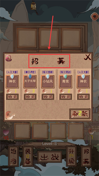 1、在【招募】界面,可消耗對(duì)應(yīng)道具購(gòu)買【神農(nóng)】【太子長(zhǎng)琴】等角色,擴(kuò)充己方陣容以提升戰(zhàn)力。