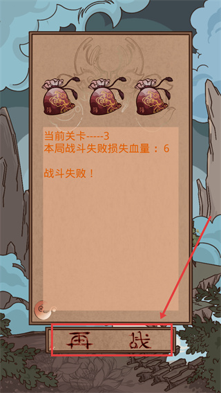 4、若【當(dāng)前關(guān)卡----3】戰(zhàn)斗失敗,點(diǎn)擊【再戰(zhàn)】按鈕可重新挑戰(zhàn),需調(diào)整陣容配置提升通關(guān)概率。